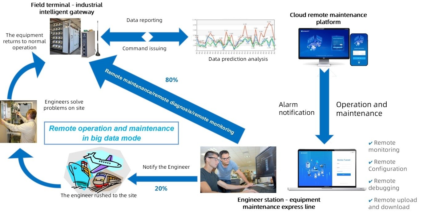 The equipment operation and maintenance platform has the function of alarming equipment abnormality. You can check the alarm and health status of the equipment through the platform. At the same time, you can set up SMS, WeChat and email for alarm notification; engineers perform remote maintenance through work orders, and realize real-time operation and maintenance monitoring through the maintenance screen. .