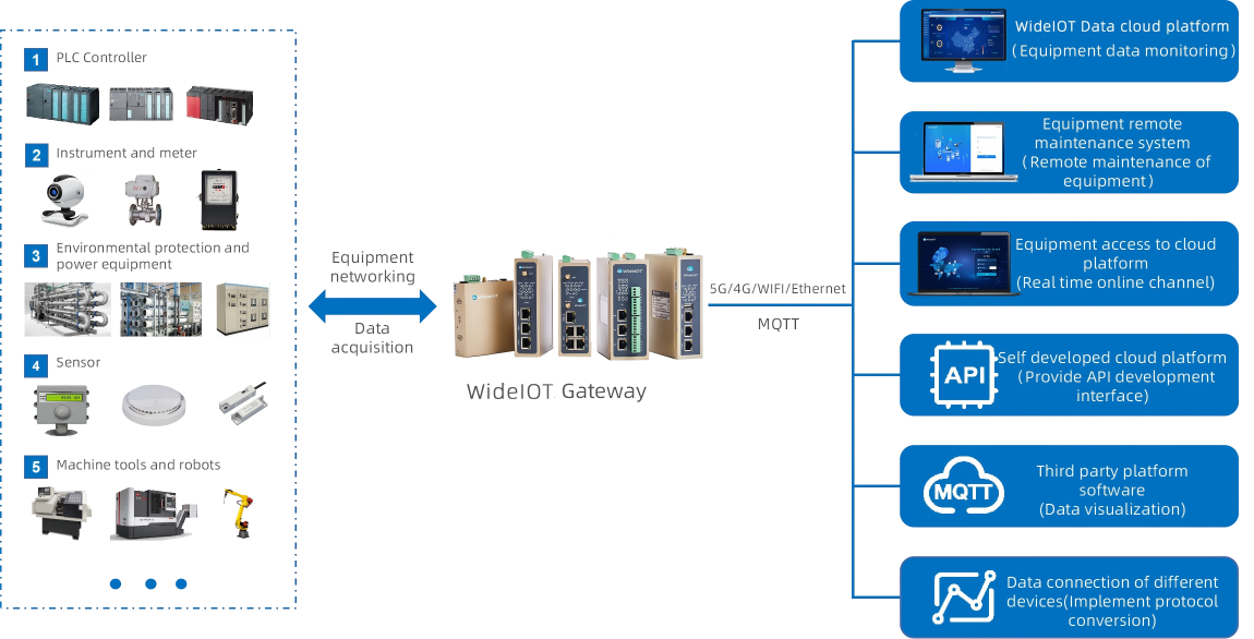 Supports access to remote software platforms through MQTT, MODBUS, OPCUA, SQL, and HTTP databases(Including: WideIOT IOT cloud platform, cloud platform independently developed by customers, IOT cloud platforms such as AWS IOT,Azure IOT,Huawei IOT,Alibaba IOT,Baidu IOT,configuration software, MES、ERP and other industrial software