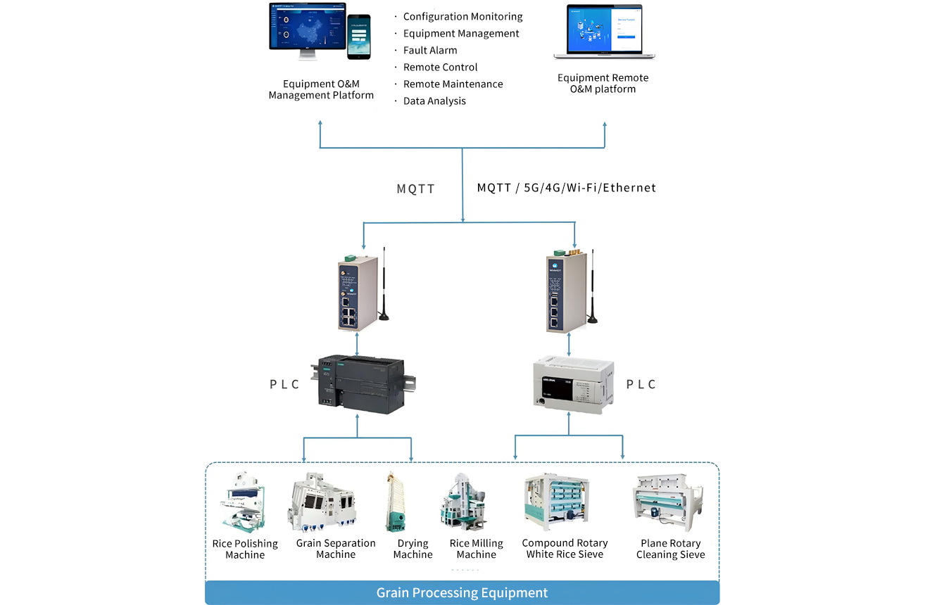 Collect PLC data of grain and oil machinery and equipment through gateways. The gateway is compatible with multiple PLC protocols and supports connection to cloud platforms or upper computers via 5G/4G/WIFI/Ethernet and other methods.