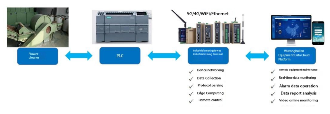 In response, WideIOT provides an industrial intelligent gateway as a core device to accomplish real-time acquisition and edge processing of vast amounts of multi-source heterogeneous data, aiding in the enhancement of production efficiency and management effectiveness.The industrial intelligent gateway connects to the PLC of the cotton cleaning machine via serial ports and network interfaces for data acquisition and real-time communication.