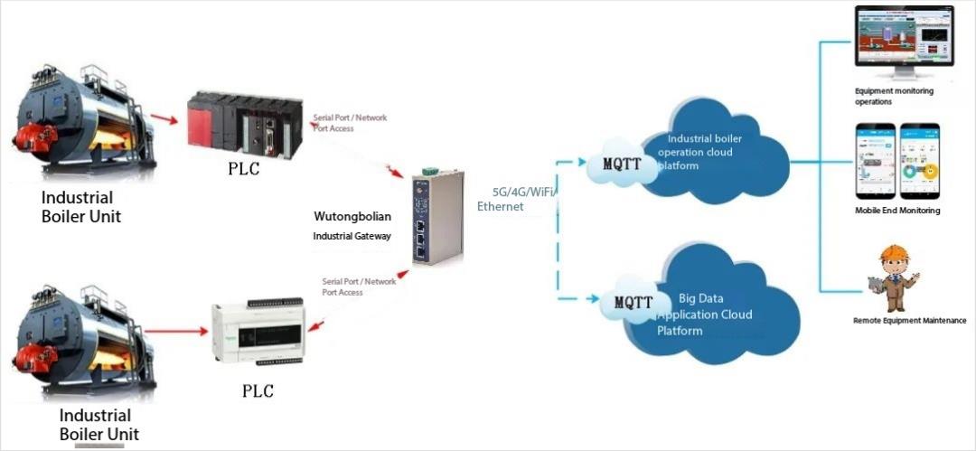 Similar to traditional boilers, they feature highly automated PLC control systems for automatic boiler production control. In response, WideIOT provides a PLC data acquisition and remote monitoring solution based on industrial intelligent gateways to further enhance intelligent energy management and optimization for boilers, primarily addressing the following issues: