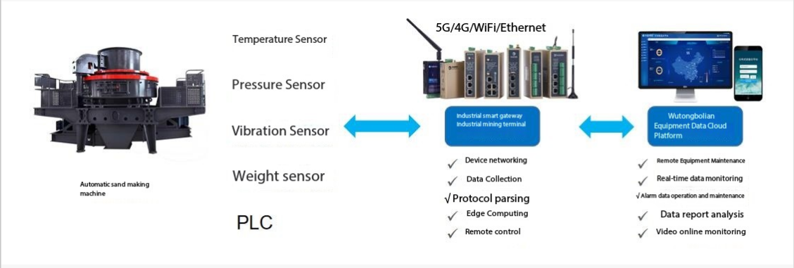 Its working principle involves using a crusher to break down stones, followed by a vibrating screen to separate and classify the stones into different sizes of sand. During the sand production process, data such as temperature, pressure, vibration, weight, voltage, and current are crucial for efficient and stable production. It is essential to collect and monitor this data in real-time to achieve refined production management and reduce material losses and energy consumption costs.By integrating the WideIOT industrial intelligent gateway into the PLC and sensors of a sand making machine, the gateway performs automated protocol parsing and data collection.