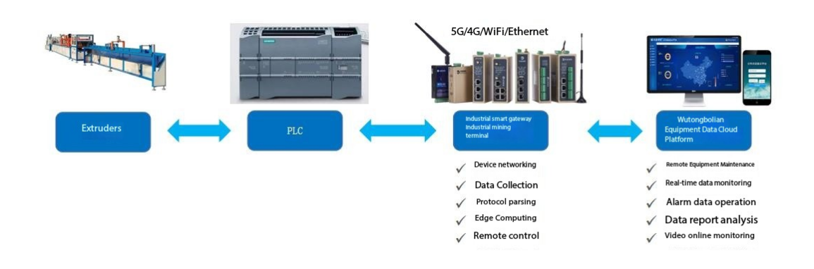 It utilizes a polymer matrix to extrude reinforcing materials (fibers or fabrics) as a continuous phase through an extruder, which are then shaped into composite materials using a molding die. The main advantages of the pultrusion process include the ability to produce thicker products with smooth surfaces, while also controlling material rheological behavior and product strength. Its products are widely applicable in various fields such as electrical engineering, anti-corrosion engineering, construction industry, and transportation.By integrating the PLC of a pultrusion machine with the WideIOT industrial intelligent gateway, the gateway can perform protocol parsing and data acquisition.