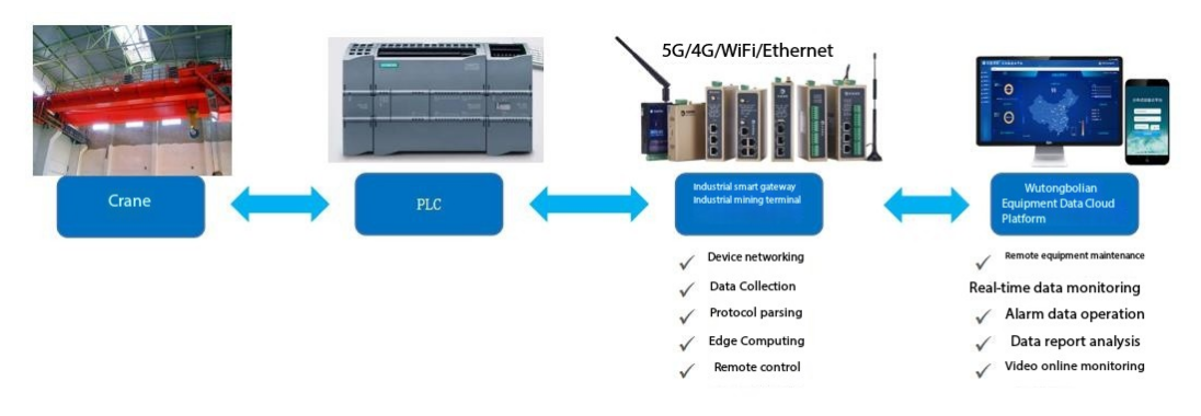 By collecting and monitoring data such as temperature, vibration, current, and voltage in real-time, the system can assess equipment status, trigger alarms, and facilitate management and maintenance, thereby strengthening on-site management levels and work efficiency.WideIOT introduces a PLC data acquisition and remote monitoring system for overhead crane equipment, primarily composed of a data acquisition gateway and a remote monitoring platform.