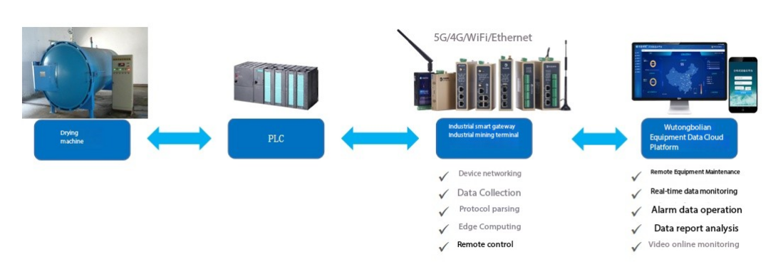The PLC is connected to the WideIOT industrial smart gateway via serial or network ports. The gateway can collect data from multiple devices and connect to the internet via 5G/4G/WIFI/Ethernet.