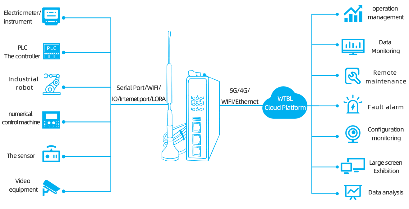 It supports access to PLCs from Siemens, Mitsubishi, Omron, Schneider, Delta, Huyuan, Keyence, Beckhoff, and others, enabling real-time data acquisition and connection to cloud platforms or upper computers' MES systems via 5G/4G/WIFI/Ethernet. This facilitates various applications such as configuration monitoring, data dashboards, fault alarms, and data analysis.Resolving PLC Network Adaptability Issues: Network segment isolators are employed to achieve network segment isolation and NAT conversion for PLCs, addressing IP conflicts that prevent internet access.