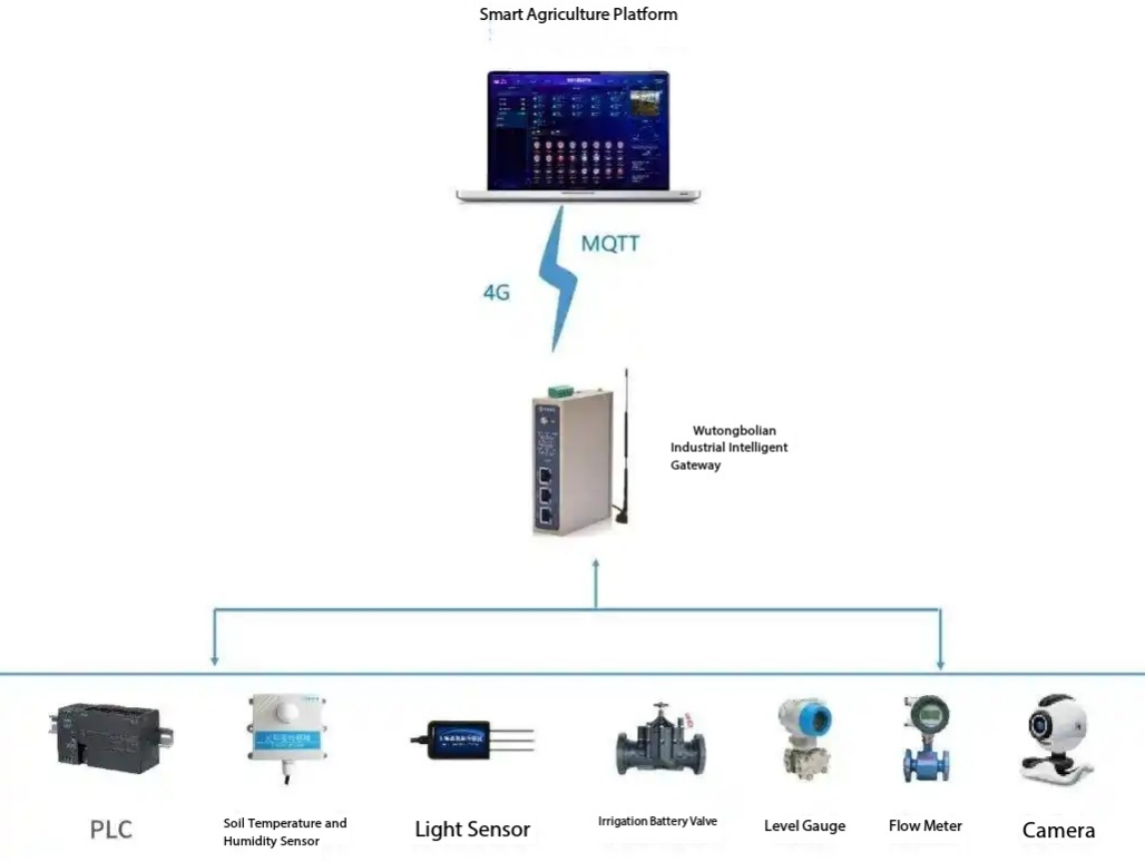 Sensor nodes deployed on the farmland site include sensors and instruments for measuring water pressure, flow rate, soil temperature and humidity, etc. By reasonably deploying WideIOT's intelligent data acquisition gateways according to the structure of the drip irrigation system and the distribution of equipment, it is possible to collect data such as water pressure, flow rate, soil temperature and humidity, and pH value, and transmit them in real-time via 4G networks to the farmland drip irrigation management platform. This enables the construction of a "digital twin smart farmland," comprehensively perceiving the operational status of the drip irrigation system and facilitating rational management, thereby further enhancing water resource utilization efficiency and agricultural production benefits.