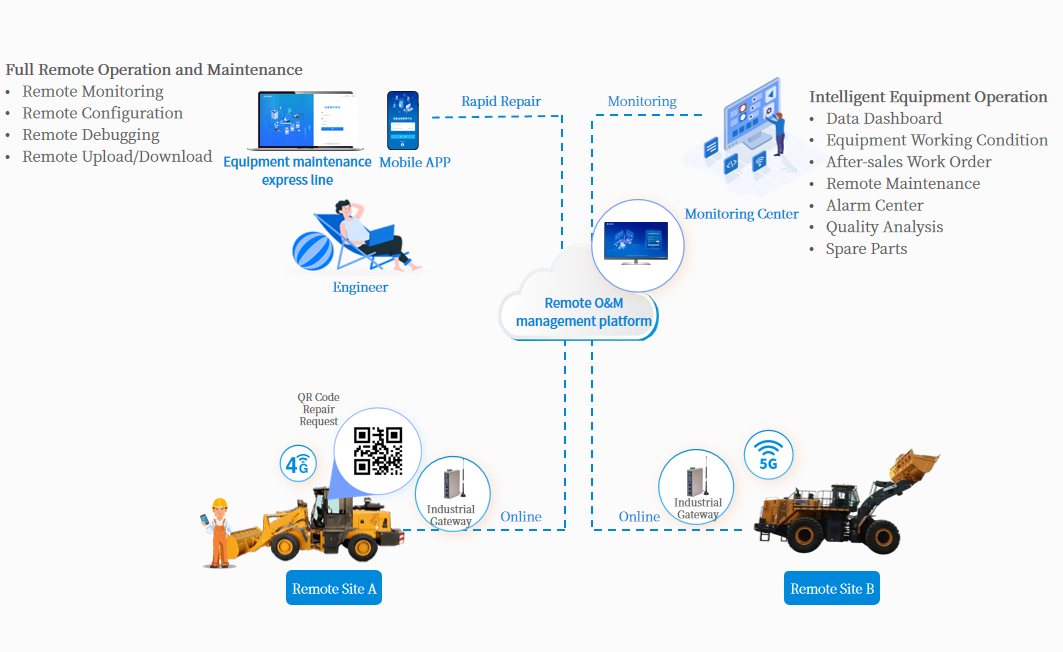 Loaders often operate independently without network connectivity. Equipment manufacturers cannot obtain real-time data such as equipment location, operating status, and alarm information, resulting in delayed fault detection and slow response. This leads to poor customer experience and undermines the enterprise’s image and reputation.