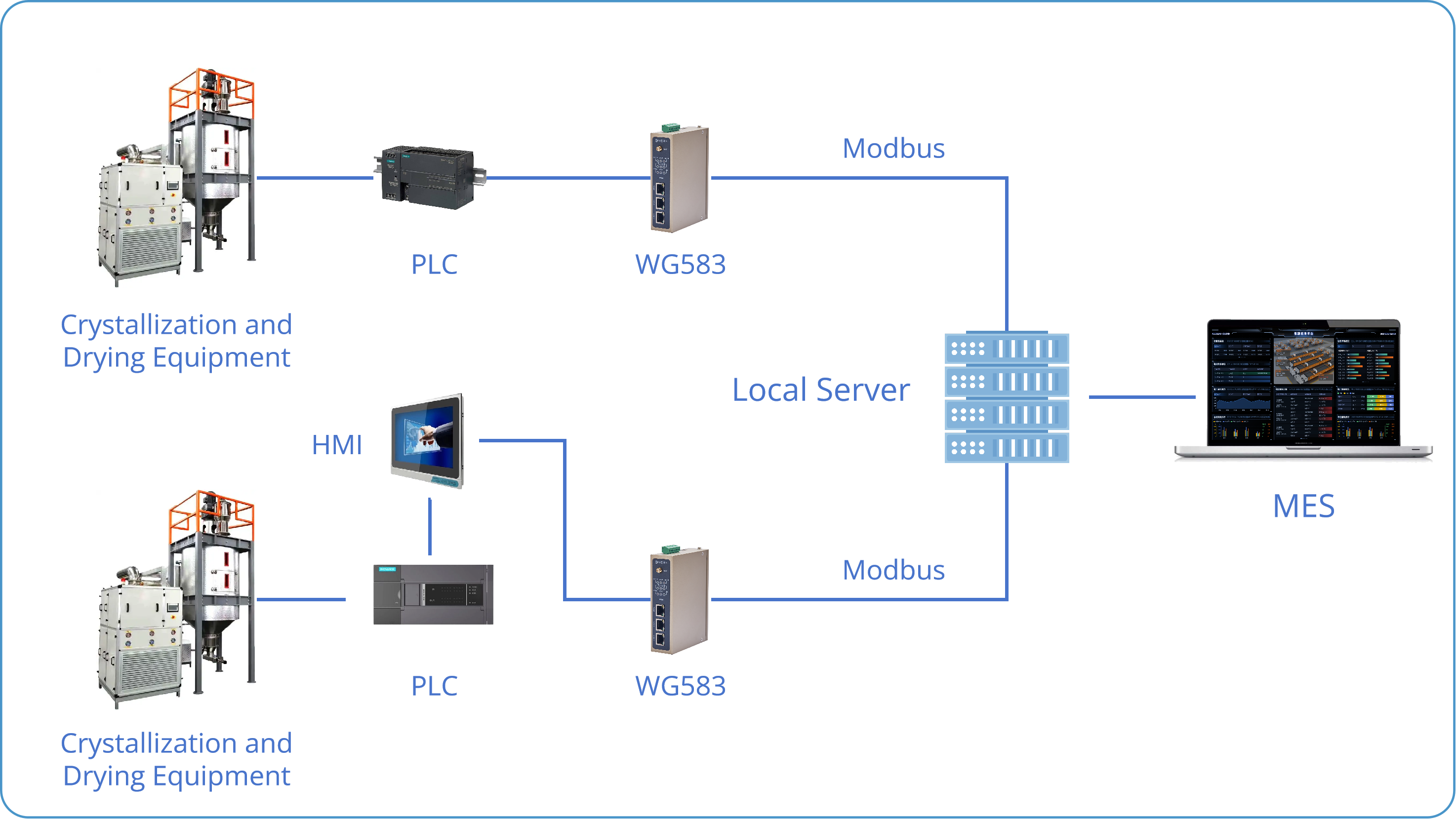 MES System Integration: The on-premises MES system requires Ethernet connectivity, with data transmission via the Modbus protocol to ensure seamless data flow.