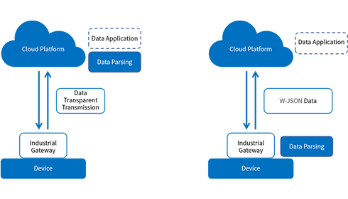 Edge Parsing: For devices with built-in drivers in the gateway, directly use edge parsing and upload standardized W-JSON format data to the cloud for storage