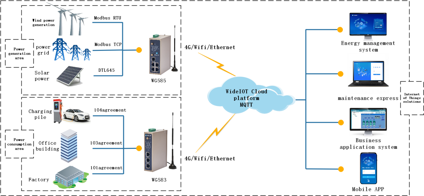 Through WideIOT's integration of industrialization and industrialization and edge computing gateway, the operation and power generation of the power generation system are monitored, and the power consumption is collected and summarized, so as to make intelligent analysis and control of power consumption and achieve the purpose of energy conservation and consumption reduction; And through the alarm function and early warning mechanism, abnormal conditions of the equipment can be found in time, and timely inspection and maintenance can be carried out to prevent accidents. The comprehensive monitoring and data analysis of the entire microgrid can realize the operation and maintenance, reasonable dispatching and decision-making of the whole process of power generation, distribution and sales.