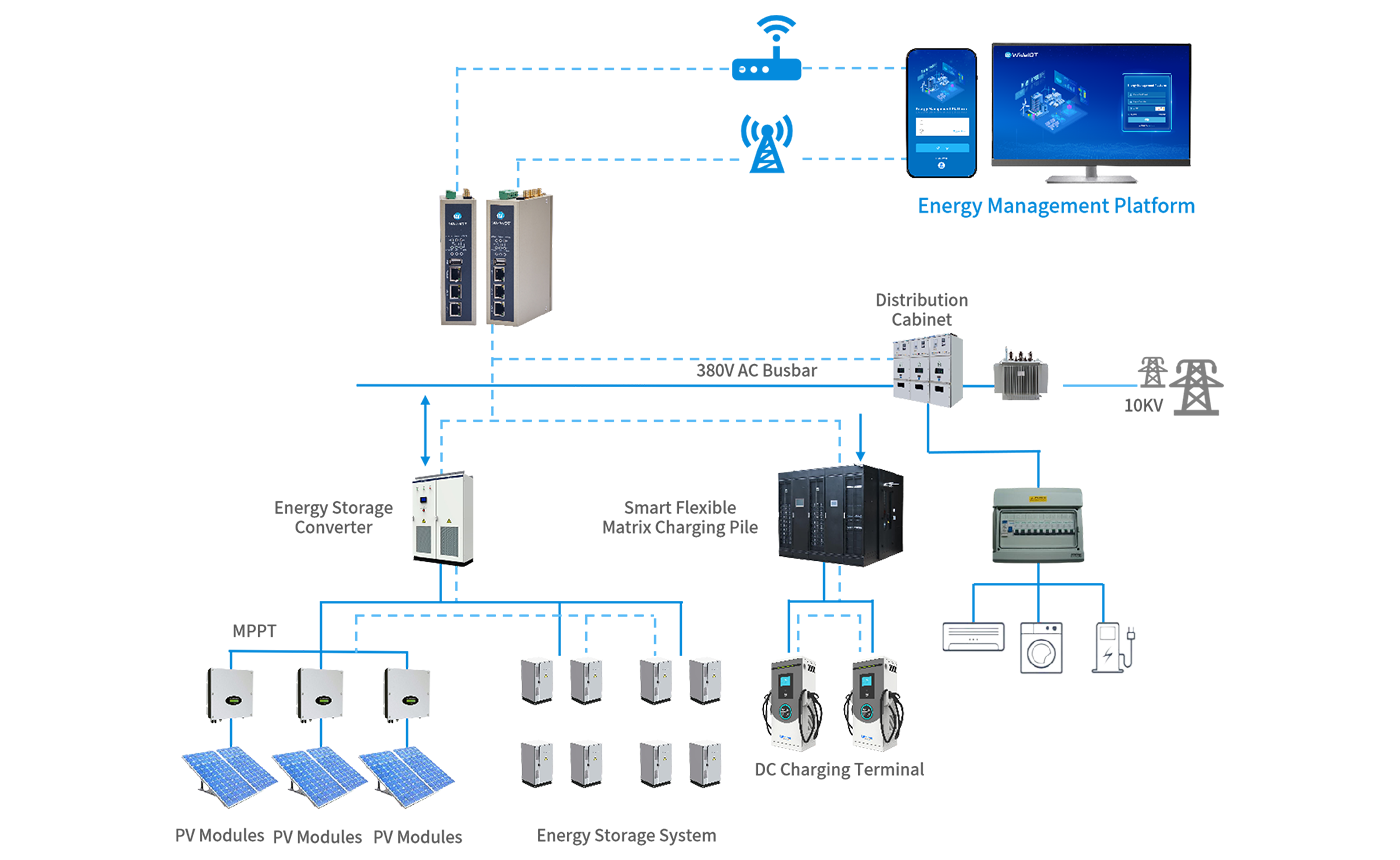 Via WideIOT's energy gateways, real-time data such as photovoltaic power generation, energy storage status, and charging demand is collected. This data is transmitted to the integrated PV-storage-charging monitoring platform (EMS), which optimizes energy dispatching among photovoltaic, energy storage, and charging devices based on real-time data and load forecasting. It enables coordinated operation of photovoltaic and energy storage systems and rational energy allocation. In the event of grid failures or emergencies, energy storage batteries can be utilized to provide emergency power supply.