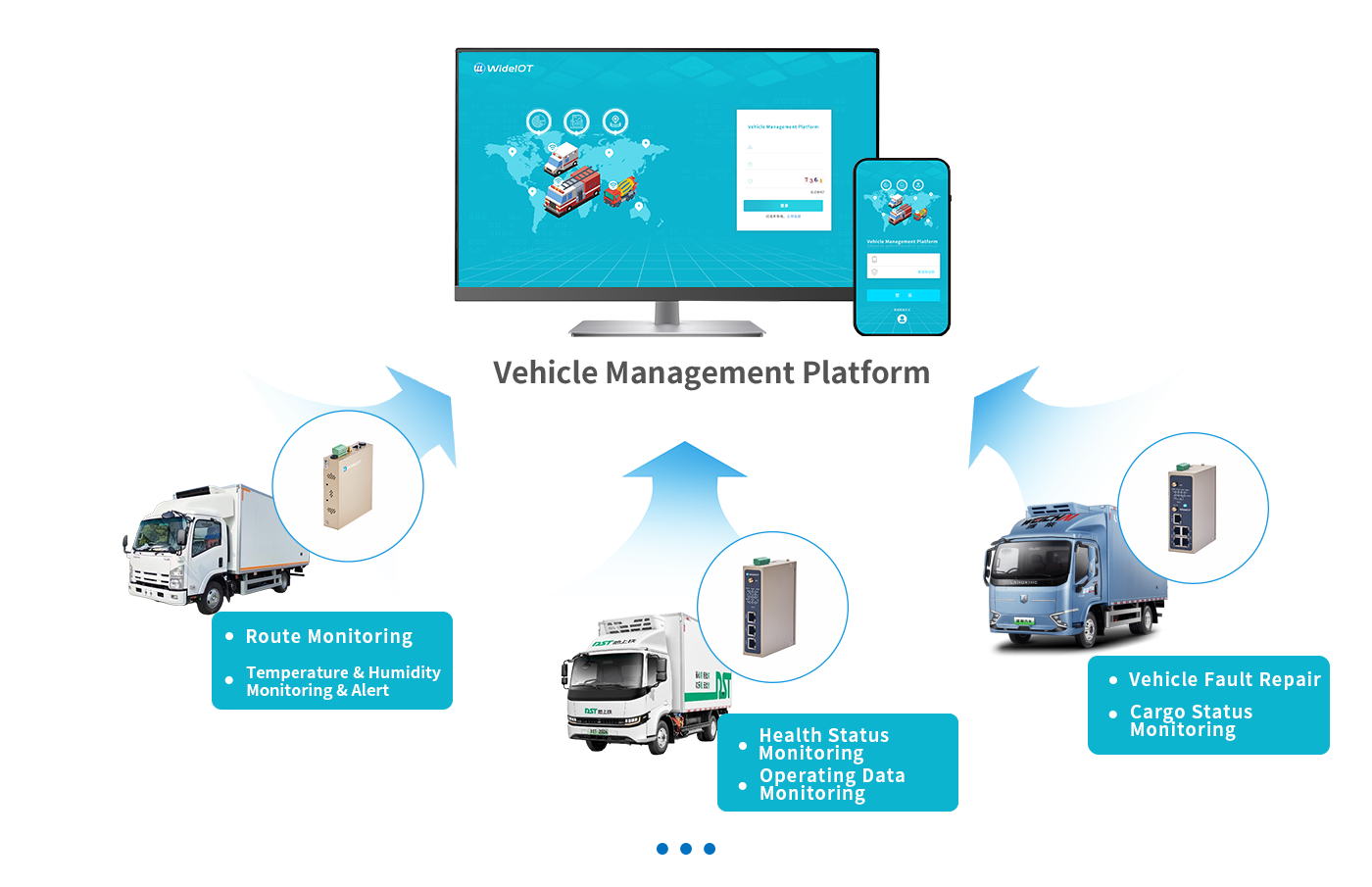 By means of WideIOT's industrial intelligent gateways, connection is established with the refrigeration systems, temperature and humidity sensors, cargo monitoring devices and other equipment of cold chain transport vehicles. Real-time data including vehicle location information, driving trajectory, temperature and humidity inside the carriage, operating parameters of refrigeration equipment (such as compressor speed and refrigerating capacity), as well as cargo status (such as cargo quantity and placement status) are collected.