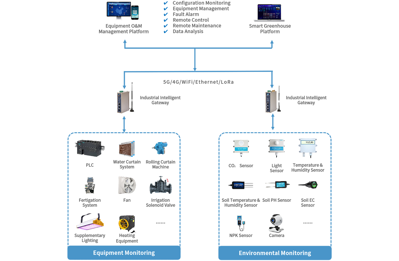 Install various sensors and monitoring devices within the greenhouse, such as temperature sensors, humidity sensors, light sensors, and soil moisture sensors. Utilize WideIOT's industrial smart gateway to collect environmental data and crop growth data from the greenhouse. Transmit the collected data to the greenhouse remote monitoring platform, where it undergoes real-time analysis and processing. Based on environmental data, the system automatically controls irrigation, fertilization, ventilation, and other equipment to achieve precise environmental regulation. By monitoring crop growth conditions, it promptly detects signs of pests and diseases and issues early warnings. It supports remote greenhouse management and optimization of cultivation plans.