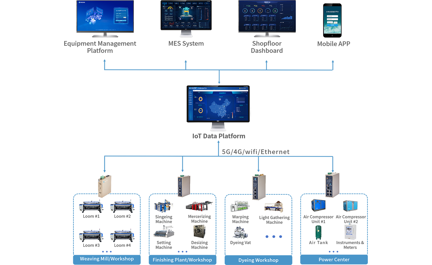 WideIOT has launched a textile factory equipment monitoring and operation and maintenance system solution based on PLC Internet of Things technology. The system connects to the PLC controllers of textile machinery via industrial intelligent gateways to collect data, and communicates in real time with the WideIOT equipment operation and maintenance management platform through 5G/4G, WiFi, Ethernet and other means, providing efficient and convenient management tools for equipment management and operation and maintenance management. The gateway can also forward data to the MES system, and analyze various equipment statuses and production parameters in conjunction with data dashboards, thereby helping to formulate scientific and reasonable business strategies and facilitating the digital transformation of textile factories.