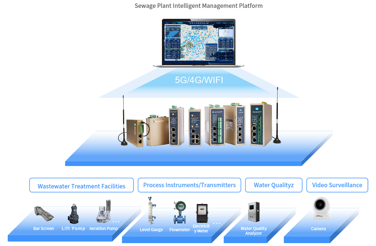 Using WideIOT's industrial smart gateway, real-time operational data is collected from various equipment within wastewater treatment plants—including pumps, blowers, screen machines, and more—covering operational status, current, voltage, temperature, as well as wastewater flow rates and quality indicators such as chemical oxygen demand (COD), ammonia nitrogen, and suspended solids. This data is transmitted to the remote monitoring platform for storage, analysis, and visualization. The platform enables real-time monitoring of equipment operation. It issues alerts promptly when equipment malfunctions or water quality indicators approach exceedance thresholds, while providing fault diagnosis and resolution recommendations. It also supports remote operation and maintenance tasks, such as equipment parameter adjustments and start/stop controls, enabling efficient management of the wastewater treatment plant.