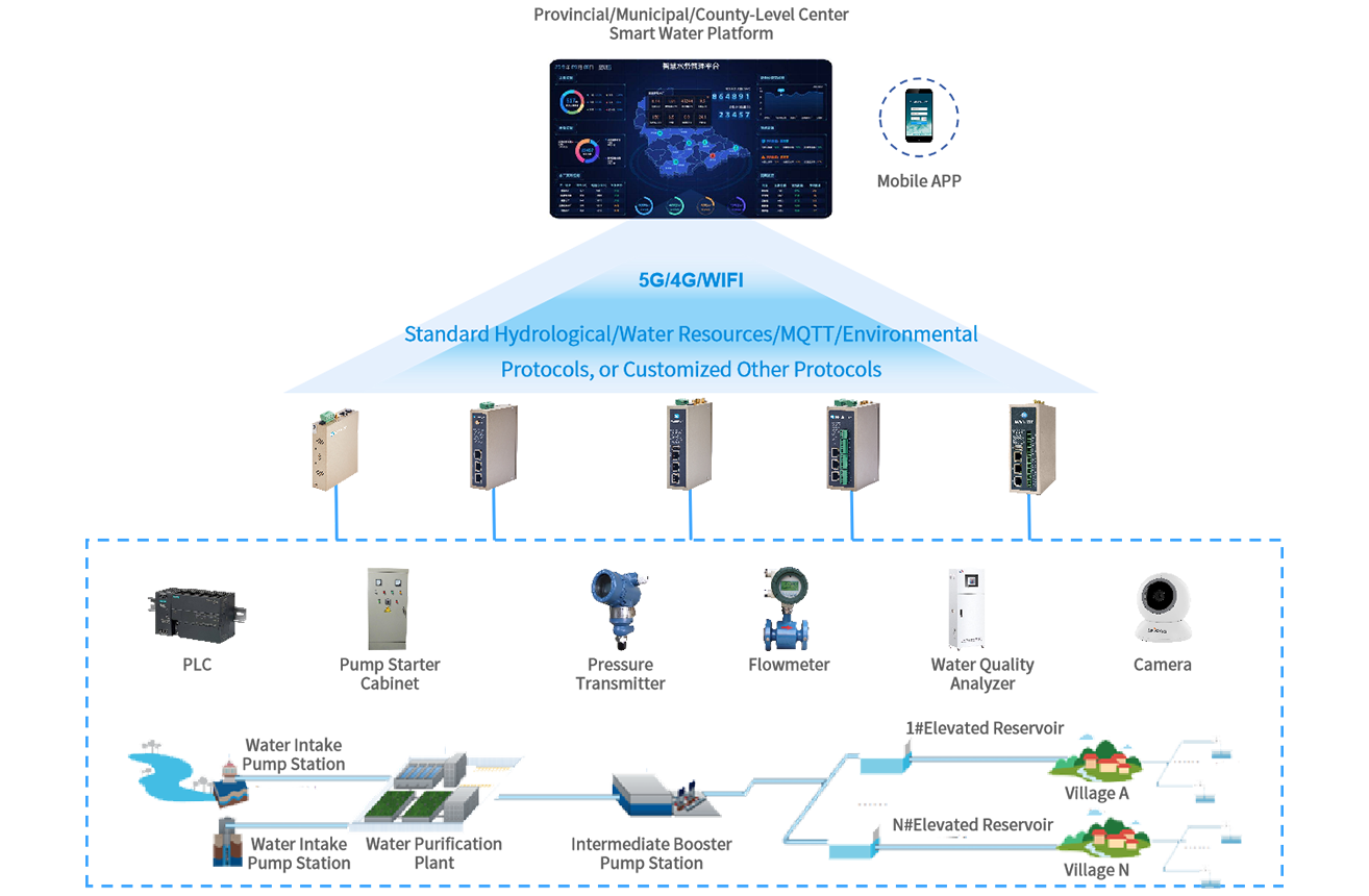 At key nodes throughout urban and rural water supply systems (such as water sources, water treatment plants, pumping stations, and pipeline networks), WideIOT industrial smart gateways collect water supply data (including water volume, water quality, and pressure). This collected data is transmitted to the integrated urban-rural water supply information management platform, where it undergoes comprehensive analysis and processing. It enables real-time water quality monitoring, optimizes scheduling based on water consumption and pipeline pressure, and ensures emergency water supply during crises. Additionally, the platform features user service management capabilities to handle complaints and inquiries, while leveraging data analysis to control operational costs.