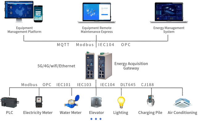 Data Acquisition: Enables data collection from various energy equipment such as water, electricity, gas, and heat to energy management systems, MES, etc.