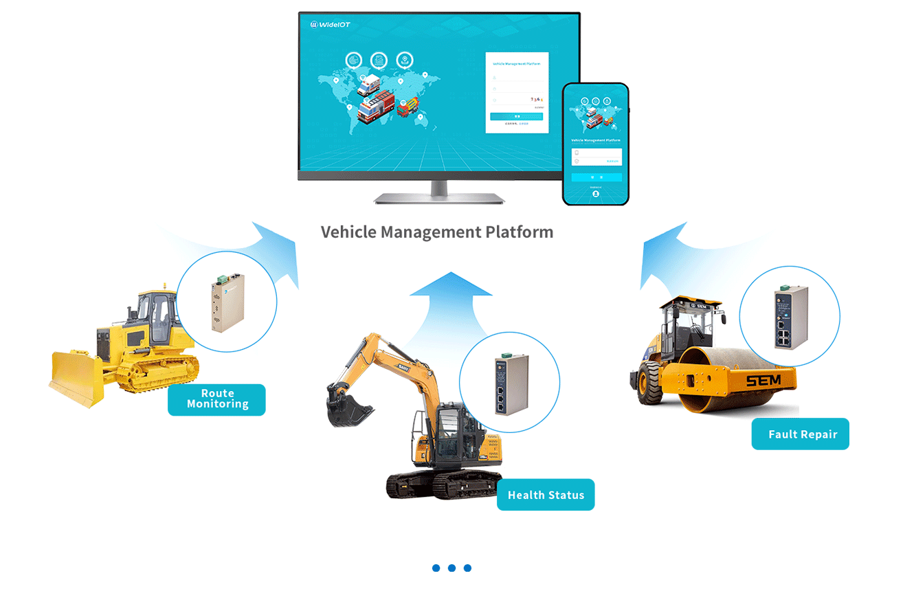 Through WideIOT's vehicle-mounted intelligent gateway, real-time data is collected including vehicle location (via GPS module), operational status parameters (such as engine RPM, oil pressure, coolant temperature, and vehicle speed), and work action data (such as excavator digging depth and angle). This data is transmitted via the gateway to the vehicle management platform. The platform provides real-time tracking of vehicle locations, visually displaying vehicle distribution and travel routes on a map. By monitoring operational parameters, the system issues timely alerts when vehicles exhibit abnormalities or potential malfunctions, providing diagnostic insights and maintenance recommendations. It also supervises whether construction vehicles adhere to operational protocols, such as speeding or improper operation. The platform further offers fuel consumption and efficiency analysis, helping users understand energy usage and operational productivity for optimized scheduling. Users can remotely dispatch and manage vehicles through the platform, including sending task instructions and adjusting travel routes.