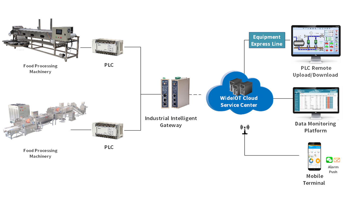 WideIOT provides a remote operation and maintenance (O&M) solution for food processing machinery. Via industrial intelligent gateways, it connects to the control systems of food processing machinery to collect data such as equipment operation parameters (e.g., temperature, pressure) and hygiene indicators (e.g., cleanliness). The data is transmitted to a remote O&M platform through secure networks, where real-time analysis is conducted to monitor the equipment’s operation status and hygiene conditions. When equipment malfunctions or hygiene indicators turn abnormal, O&M personnel are promptly notified to address the issues. Additionally, the solution supports remote O&M operations to ensure the stable running of the machinery.