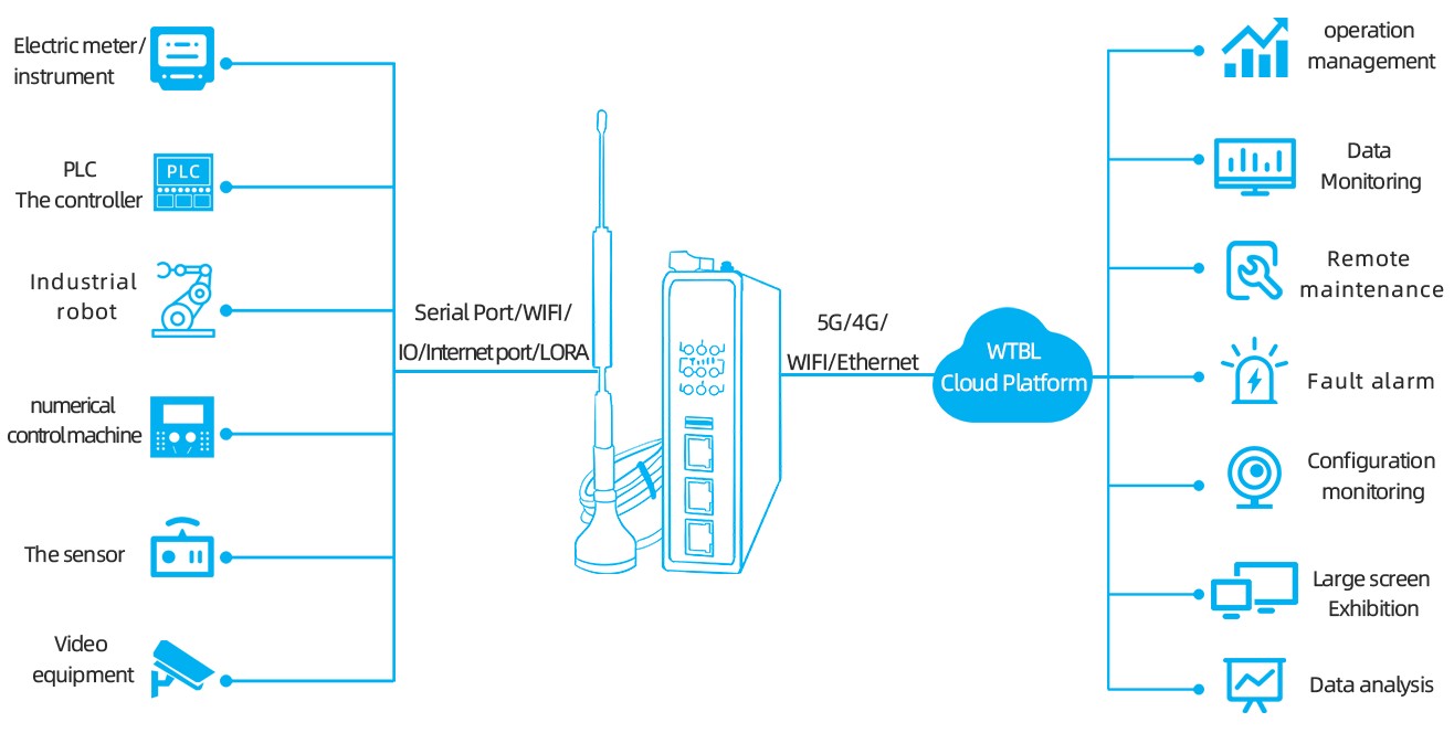 Simultaneous Access to Different Cloud Platforms and Software: It supports北向 (Northbound) access to remote software platforms such as IoT cloud platforms, SCADA systems, and MES systems through protocols like MQTT, MODBUS, OPC UA, SQL, and HTTP databases.