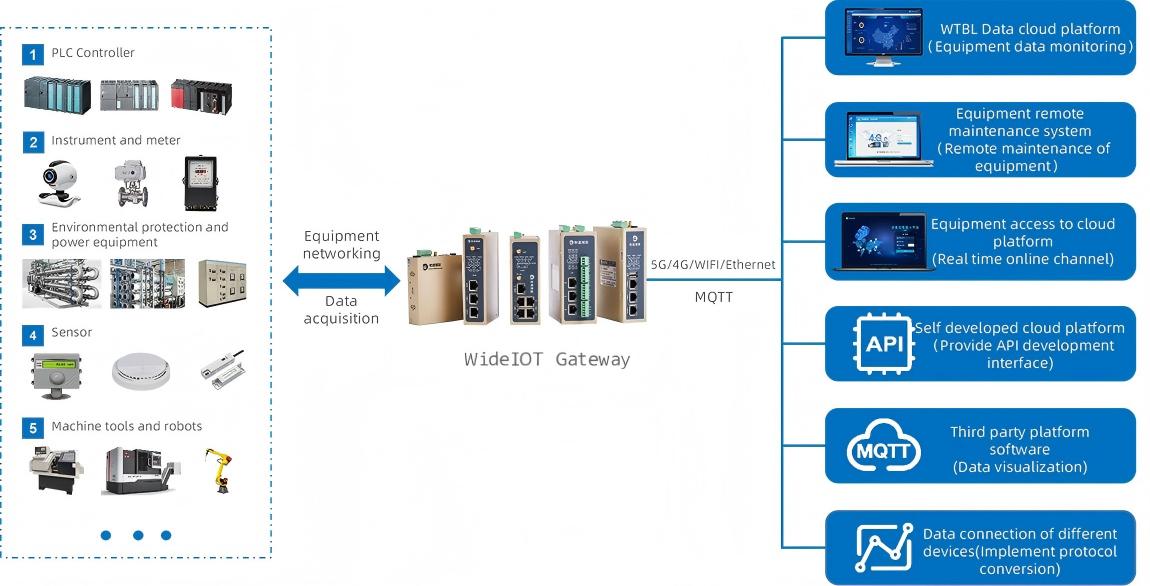 Laboratories typically house a variety of high-precision experimental equipment and materials. If these critical assets are not precisely and timely maintained and managed, it could impact experimental results. For instance, equipment failure downtime, material deterioration, fire hazards, etc., are all issues that laboratory management must strive to avoid. In response, WideIoT provides a laboratory IoT centralized monitoring and management system solution based on industrial intelligent gateways.By integrating PLCs, instruments, sensors, and other devices through industrial intelligent gateways, the system achieves protocol conversion and data standardization processing.