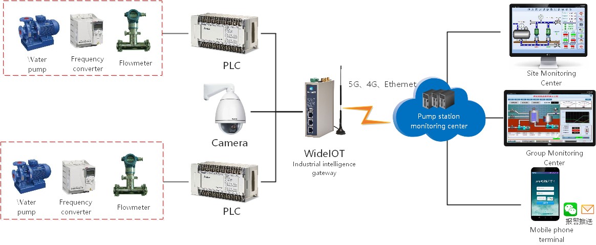 By deploying industrial gateways on-site to connect to the PLCs, the system can upload the real-time status of pumping station equipment and process parameters to the smart water plant management platform via 4G networks. Simultaneously, it can receive remote diagnostic commands and program update packages issued by the management layer, supporting remote PLC program downloading and parameter debugging, thus achieving efficient collaboration between on-site control and remote management. Additionally, it can integrate cameras in areas such as the pump rooms and power distribution rooms to enable integrated management of production and security scenarios.