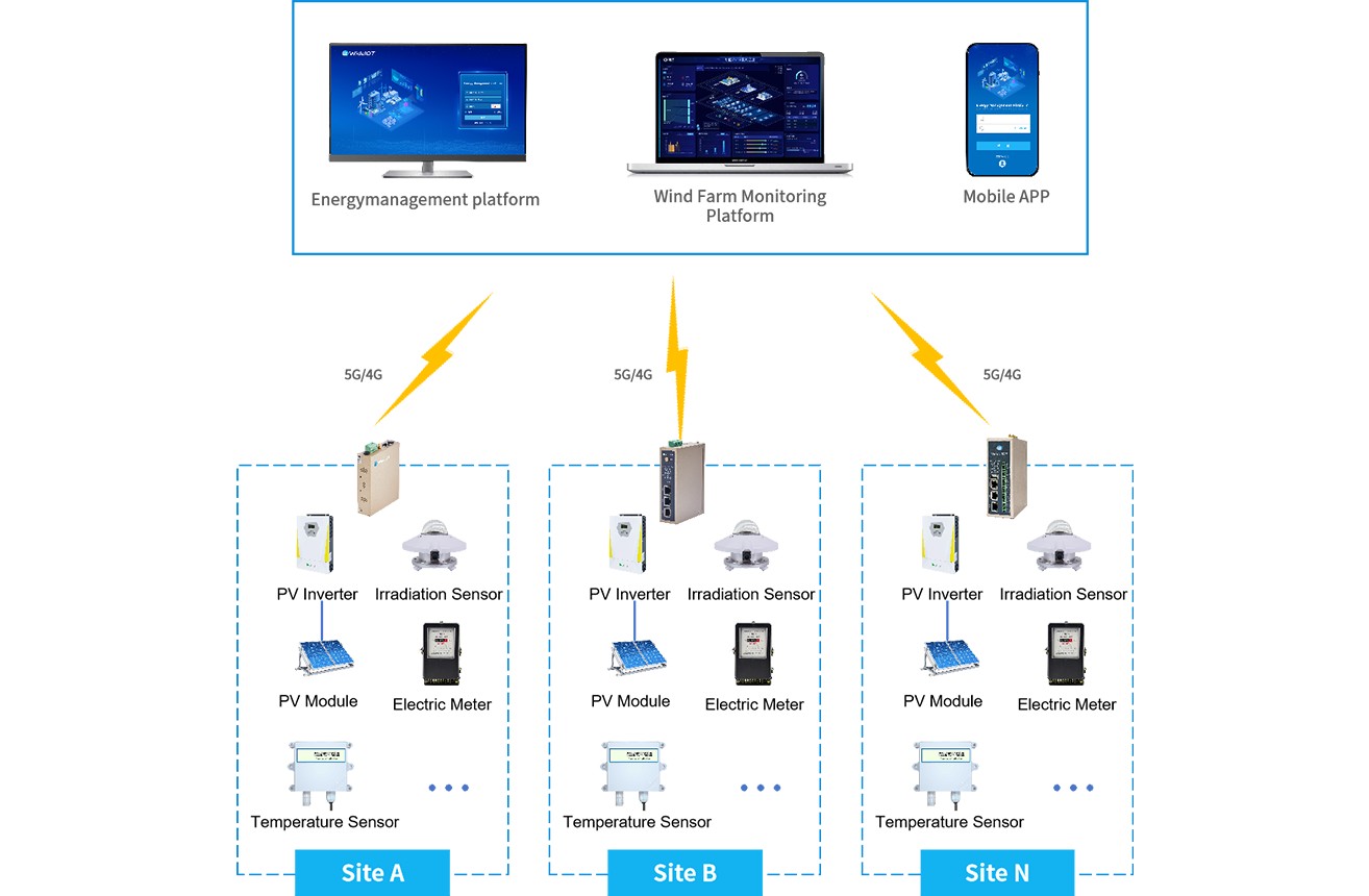 WideIOT’s industrial IoT gateway connects to smart meters, solar inverters, and other devices to collect realtime data including active power, reactive power, apparent power, voltage, and current. Using edge computing, it calculates power factor, energy generation, and other key metrics. The data is then transmitted to a solar management platform via 4G/5G or other networks. This enables companies to monitor equipment status and operational performance across multiple sites, quickly detect anomalies, and take control—boosting both management efficiency and operational reliability.