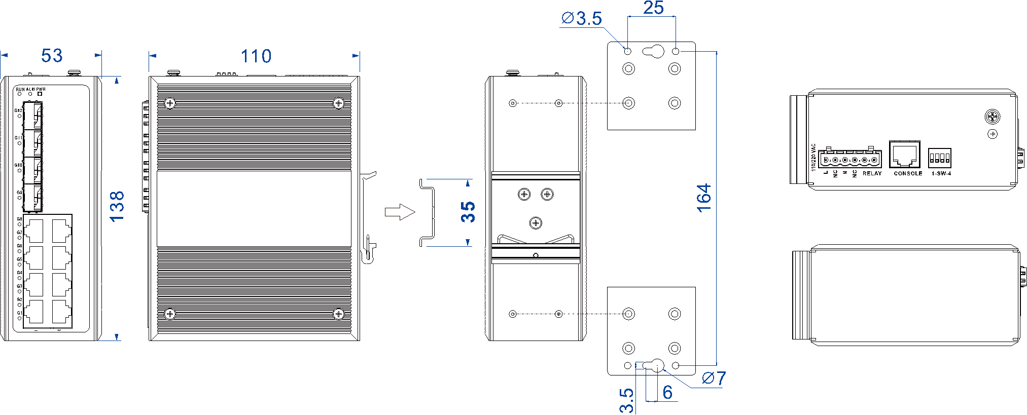 | Mechanical Structure | Enclosure: IP40 protection level, metal enclosure Installation: DIN rail or wall-mounted installation Weight: ≤0.78kg Dimensions (width × height × depth): 53mm × 138mm × 110mm |