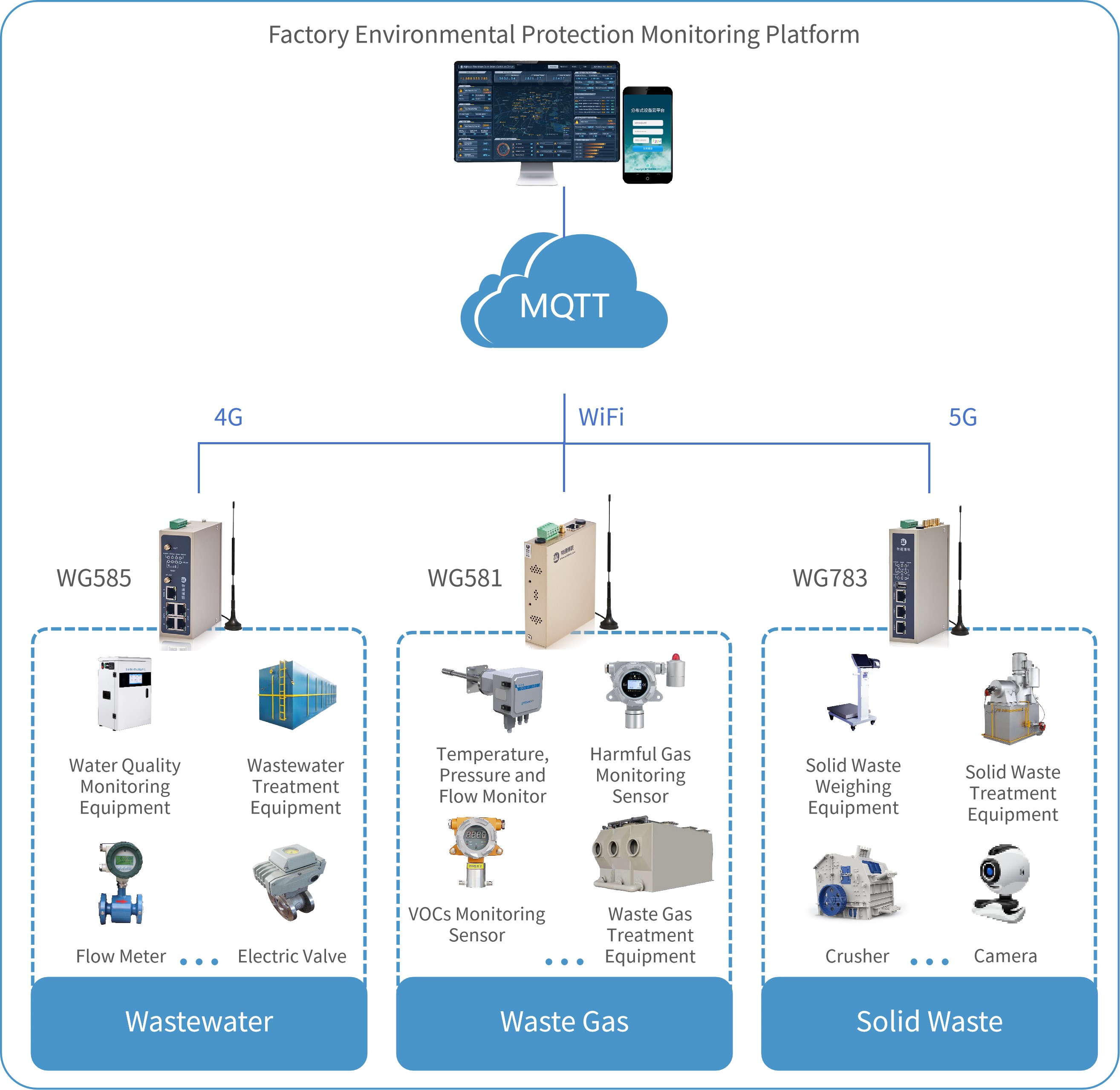- Peripheral Monitoring Devices: Waste gas sensors (VOCs, harmful gases), water quality monitors, flow meters, solid waste weighing equipment, crushers, wastewater treatment equipment, waste gas treatment equipment, cameras, electric valves, temperature/pressure/flow monitors.