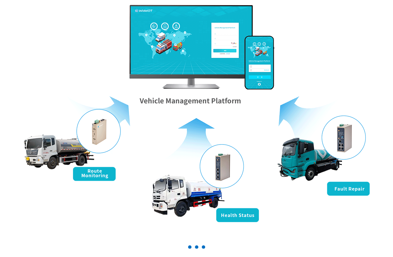 Using WideIOT's vehicle gateway installed on sprinkler trucks, it connects to the vehicle's positioning system, water pump control system, water tank level sensors, water quality sensors, and other equipment. It collects real-time data including the sprinkler truck's location, operational status (whether watering, watering speed, etc.), water tank volume, and water quality parameters, then transmits this data to the remote monitoring platform. Based on the collected data, the platform enables real-time tracking and operational status monitoring of the sprinkler trucks. Intelligent algorithms optimize operational routes to enhance efficiency. In cases of malfunctions or low water levels, the system promptly issues alerts and coordinates maintenance or refilling operations.